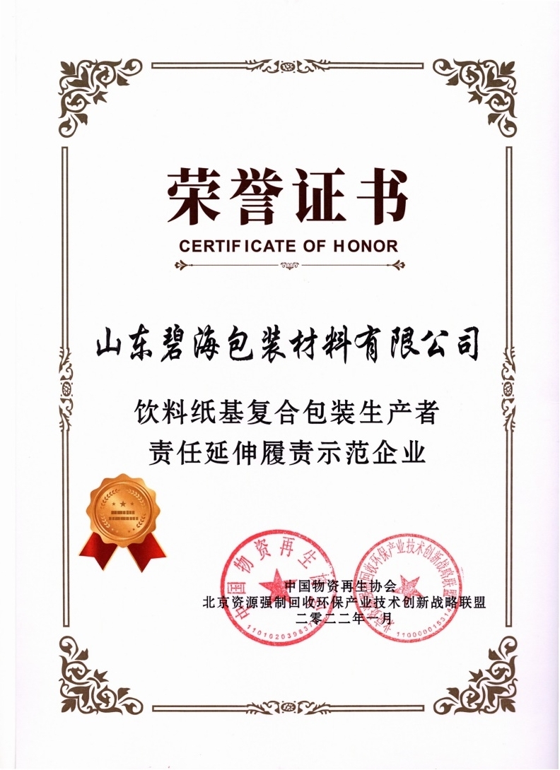 2022年1月12日,中國(guó)飲料紙基復(fù)合包裝可持續(xù)發(fā)展協(xié)作體2021年度會(huì)議在北京召開。會(huì)議對(duì)碧海公司在2021年推行環(huán)境友好包裝設(shè)計(jì)、開發(fā)可再生原料包裝、共建飲料紙基復(fù)合包裝回收協(xié)作體、規(guī)范回收利用等方面的工作給予了肯定,授予“飲料紙基復(fù)合包裝生產(chǎn)者責(zé)任延伸履責(zé)示范企業(yè)”榮譽(yù)稱號(hào)。